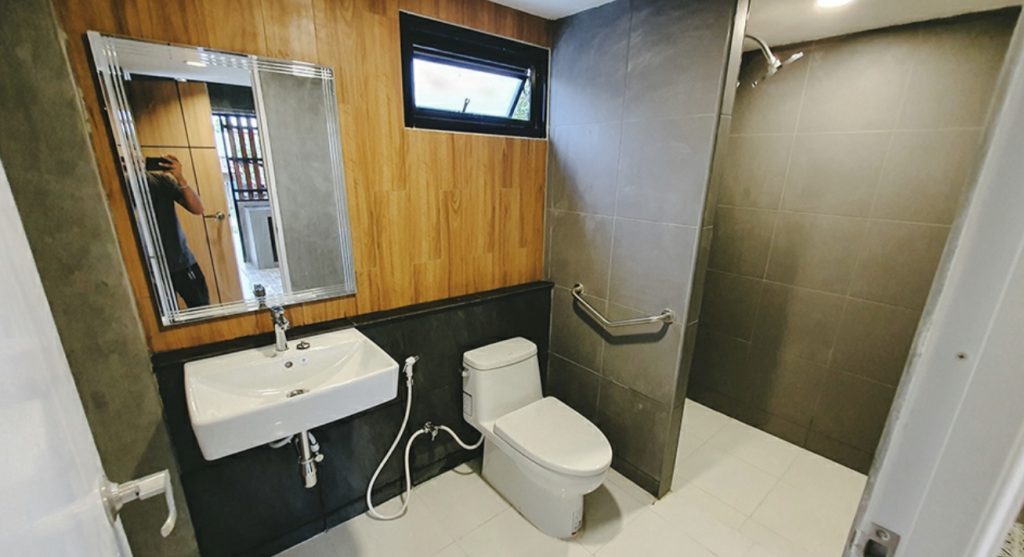 ห้องน้ำแยกส่วนเปียกแห้งเน้นผนังโทนสีเทาเข้มและผนังไม้