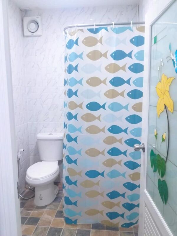 ห้องน้ำขนาดพอเหมาะกระเบื้องผนังสีขาวกั้นส่วนอาบน้ำด้วยผ้าม่านลายปลาน่ารักๆ