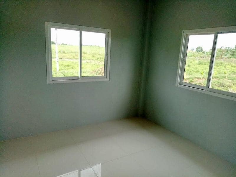 ห้องนอนออกแบบเรียบง่าย ขนาดพอเหมาะ ผนังห้องโทนสีเข้มพื้นสีครีม มีหน้าต่างช่วยระบายความร้อนและเปิดรับลมเย็นๆได้สบาย เหมาะกับการพักผ่อน