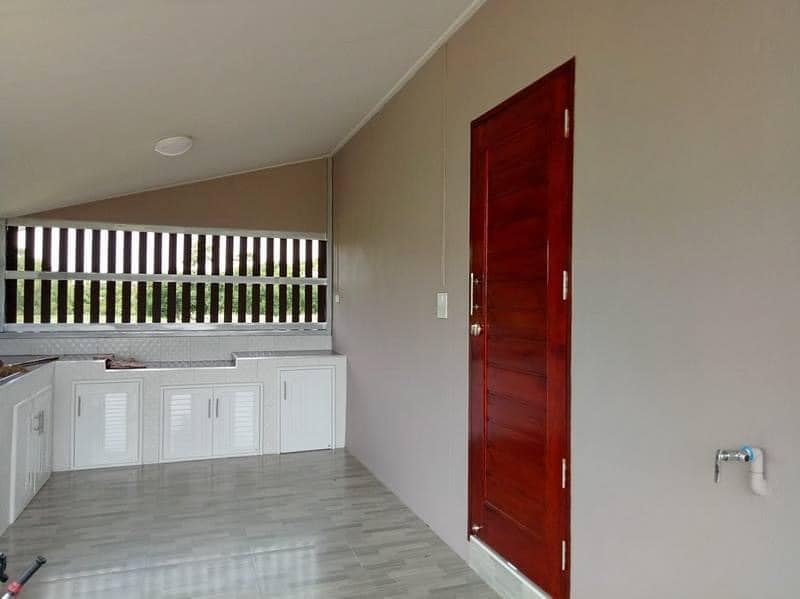 ห้องครัวถือว่ากว้างขวางทีเดียว อยู่บริเวณท้ายสุดของบ้าน ตีไม้ระแนงเว้นร่องห่างๆ หน่อยเพื่อให้ห้องครัวดูโปร่ง ไม่มีกลิ่นอับสะสมเหมาะกับเป็นครัวไทย โทนสีห้องครัวใช้โทนสีขาวสะอาดตา น่าใช้งาน