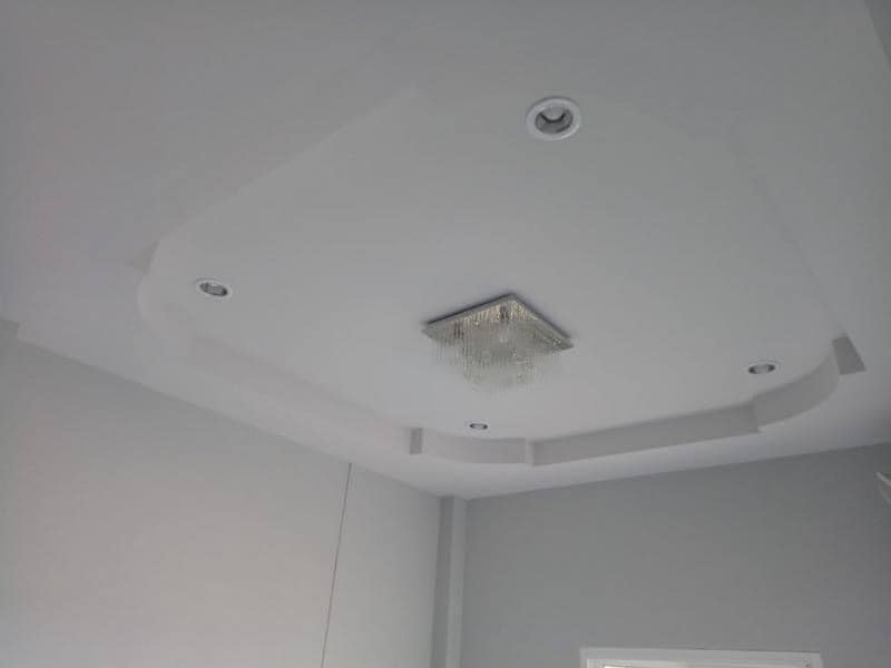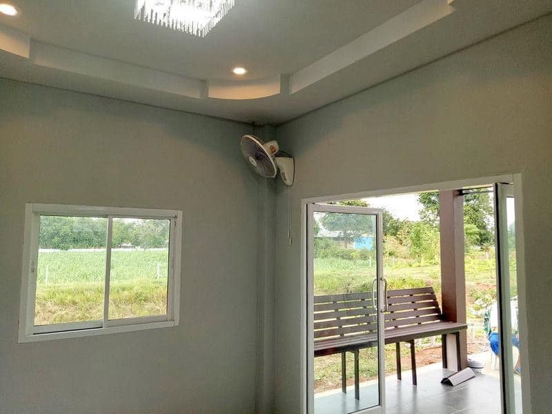 ฝ้าเพดานด้านในบ้านออกแบบเป็นฝ้าหลุมสวยงาม ติดโคมไฟหรูหราตรงกลาง และติดดาวไลท์รอบๆ ช่วยให้บ้านดูสวยน่ามอง