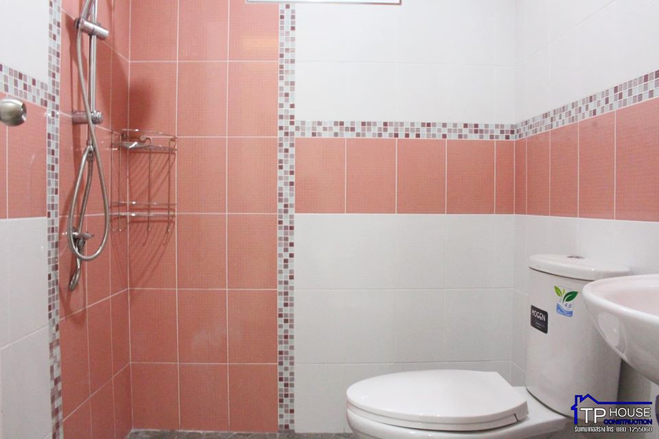 ห้องน้ำโทนสีชมพูสลับสีขาว เพิ่มลูกเล่นด้วยกาติดโมเสกโทรนสีเดียวกัน ห้องน้ำจัดวางสุขภัณฑ์พร้อมใช้งาน