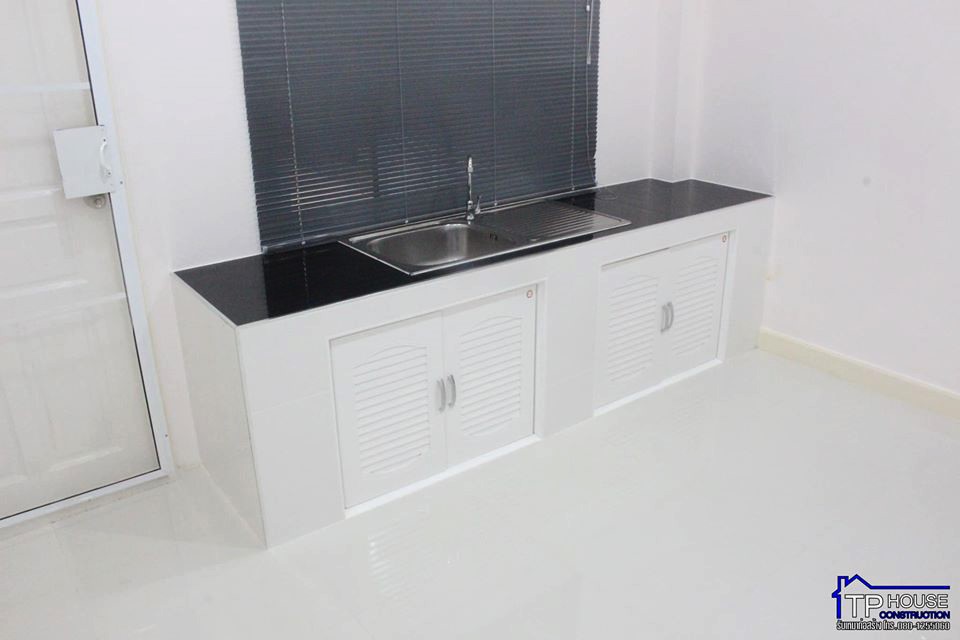 ห้องครัวโทนสีขาวสะอาดตา เคาร์เตอร์ครัวใช้สีขาวท็อปด้านบนสีดำเพื่อง่ายต่อการทำความสะอาด