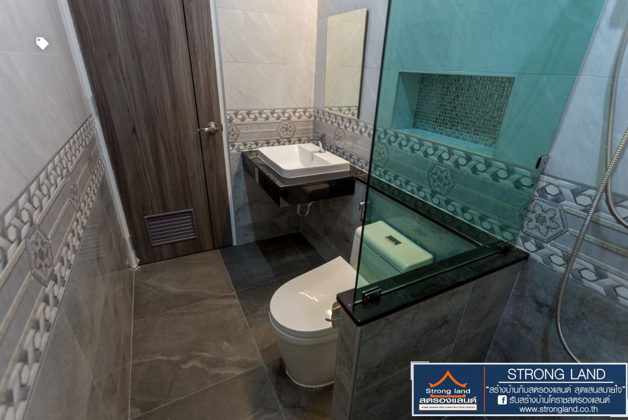 ห้องน้ำกว้างขวางออกแบบสวยงามกระเบื้องสีเทากระเบื้องลายสวยแยกส่วนเปียกแห้ง