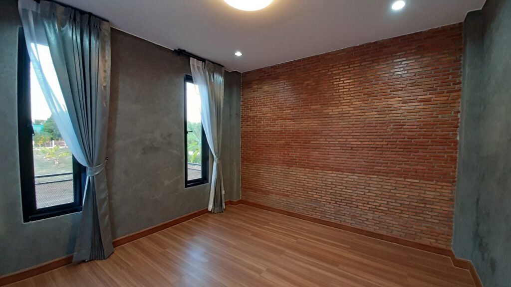 บ้านหลังออกแบบสไตล์โมเดิร์นลอฟท์ หลังคาเพิงแหงนสองระดับ ใต้หลังคาตกแต่งด้วยไม้เทียมสีน้ำตาลเข้ม ผนังบ้านเน้นผนังปูนเปลือยขัดมัน ตกแต่งจุดดึงสายตาด้านหน้าด้วยอิฐโชว์ลายสีน้ำตาล หน้าต่างประตูกระจกใสขอบสีดำ เข้ากับสไตล์ของบ้าน