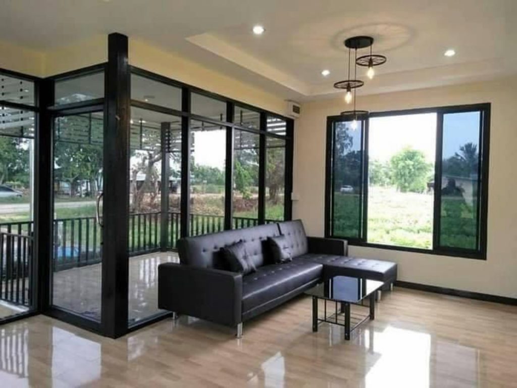 ด้านในกว้างขวางและดูโล่งโปร่งเนื่องจากออกแบบให้เป็นกระจกแทบทั้งหมด พื้นปูกระเบื้องลายไม้ ติดม่านสองชั้นม่านโปร่งช่วยให้บรรยากาศในบ้านดูอบอุ่นผ่อนคลาย ฝ้าหลุมแบบเรียบง่าย เพิ่มความโดดเด่นด้วยโคมไฟสไตล์โมเดิร์นเหมือนร้านกาแฟไม่มีผิด