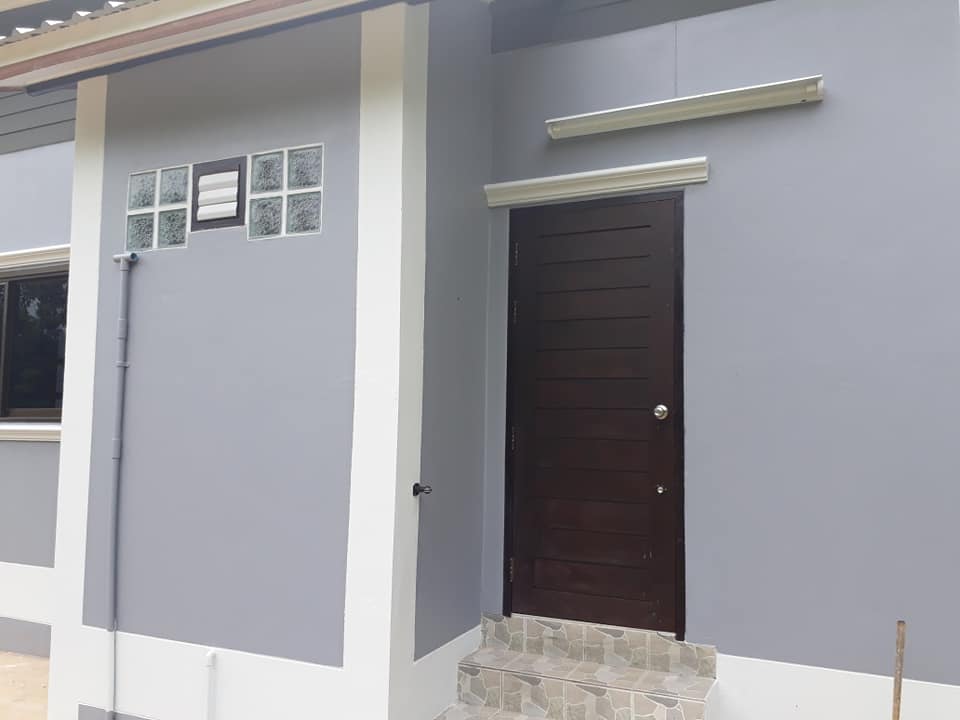 ด้านหลังบ้านมีประตูไม้สีน้ำตาลเข้มสำหรับเข้าออกบ้านได้อีกทางหนึ่ง