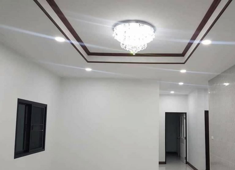 ด้านในบ้านเน้นผนังโทนสีขาว โคมไฟรูปทรงหรูหรา เข้ากันได้อย่างลงตัวกับฝ้าเพดานที่ออกแบบเป็นฝ้าหลุมสวยงาม