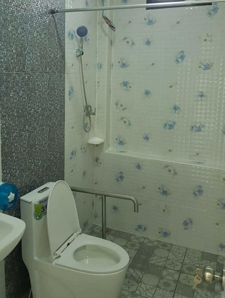 ห้องน้ำออกแบบให้มีราวจับสำหรับผู้สูงอายุ ผนังกระเบื้องลายดอกไม้สีม่วงดูสวยงามน่ามอง จัดวางสุขภัณฑ์พร้อมใช้งาน