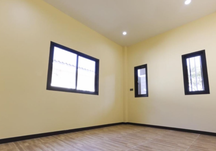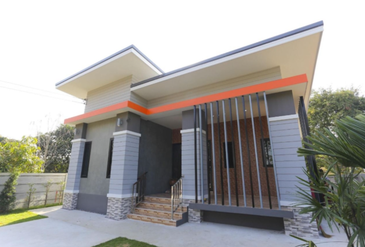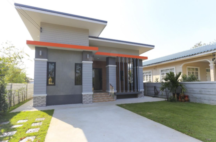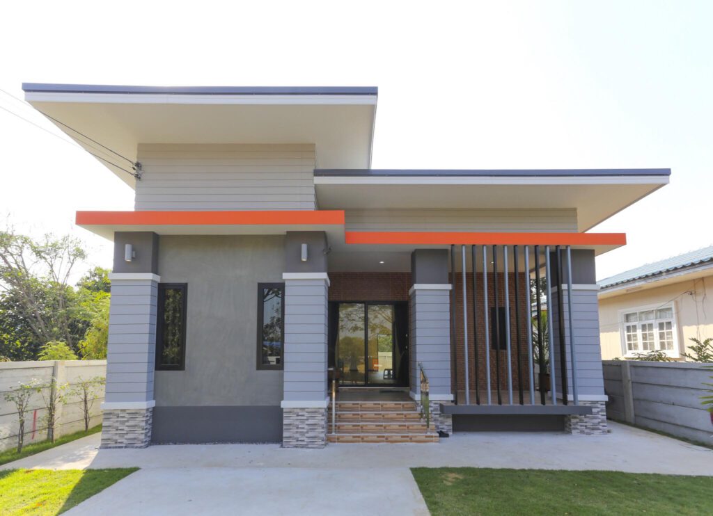 บ้านชั้นเดียวสไตล์โมเดิร์น ขนาดพอเหมาะ ออกแบบสวยงามทันสมัย น่าอยู่ ขนาดบ้านกำลังพอเหมาะสำหรับครอบครัวขนาดกลาง ด้านหน้าบ้านเทพื้นปูนก่อนทางเข้าบ้าน ด้านข้างปูสนามหญ้าสีเขียว เป็นผลงานการสร้างจาก รับสร้างบ้าน Bun Home Design&Building