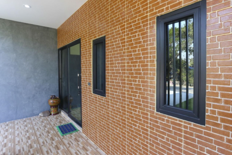 ระเบียงหน้าบ้านมีการปูพื้นด้วยกระเบื้องโทนสีน้ำตาล ฝ้าเพดานสีขาวติดไฟดาวไลฟ์เผนังบ้านฝั่งประตูทาสีเป็นลวดลายอิฐแดงโชว์