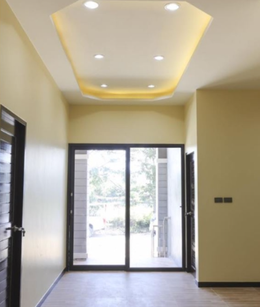ห้องโถงกว้างขวางฝ้าเพดานเป็นฝ้าหลุมทรงเหลี่ยมติดไฟดาวน์ไลท์และซ่อนไฟสีเหลืองนวล ผนังห้องสีครีมอ่อนๆ