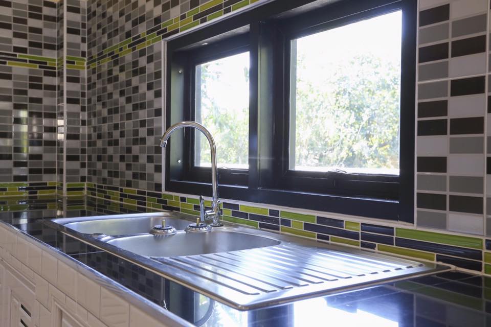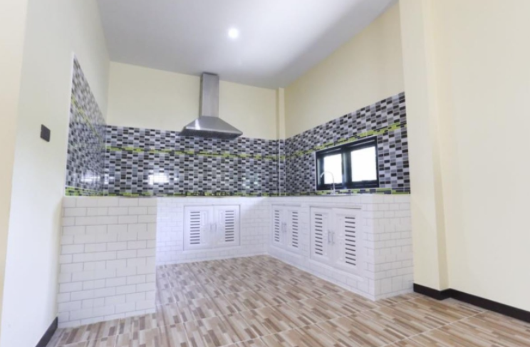 ห้องครัวพื้นห้องปูกระเบื้องสีน้ำตาลลายไม้ เคาน์เตอร์ใช้กระเบื้องสีขาว บริเวณด้านล่างเคาน์เตอร์ทำตู้สำหรับเก็บอุปกรณ์เครื่องใช้ภายในห้องครัว ผนังห้องครัวฝั่งที่เป็นเคาน์เตอร์ กรุผนังด้วยกระเบื้องลายโทนสีดำ ติดเครื่องดูดควันสำหรับดูดกลิ่นภายในห้องครัวขณะประกอบอาหาร