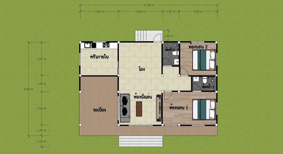 บ้านชั้นเดียวสไตล์โมเดิร์น โทนสีน้ำตาลอ่อน 2 ห้องนอน 1 ห้องน้ำ สีสวยละมุนยกพื้นดูโดดเด่น