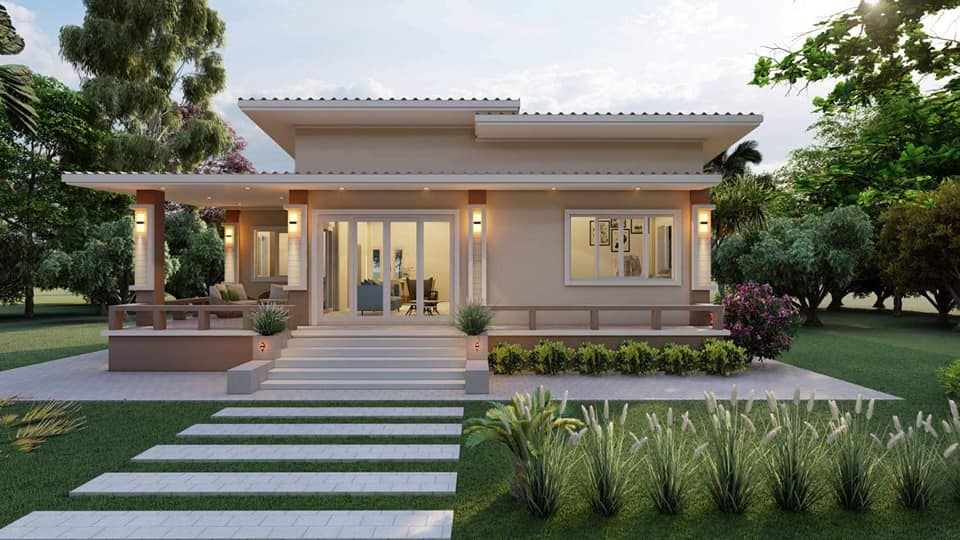 แบบบ้านชั้นเดียวสไตล์โมเดิร์น หลังคาแบบทรงแหงนซ้อนระดับดูมีมิติ ตัวบ้านยกระดับพื้นสูงประมาณ 80 เซนติเมตร ในระดับที่สวยงามกำลังพอดี ผนังภายนอกแบบปูนฉาบเรียบโทนสีน้ำตาลอ่อนตัดขอบด้วยสีน้ำตาลที่เข้มขึ้นมาเล็กน้อยดูเข้ากันได้อย่างลงตัว ประตูและหน้าต่างแบบกระจกคิ้วบัวสีขาว ระเบียงหน้าบ้านระด้านข้างกว้างขวาง