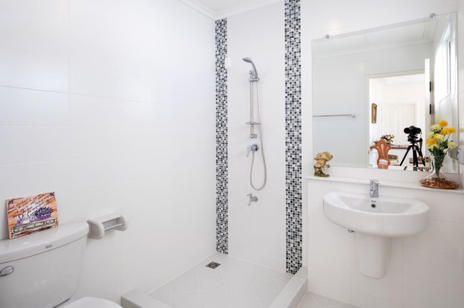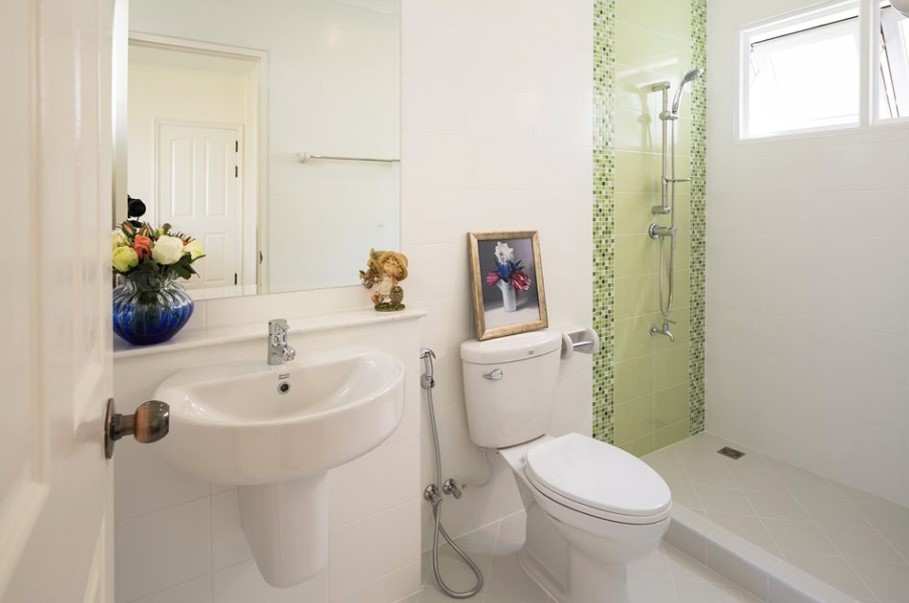 ห้องน้ำโทนสีขาวเรียบง่าย แยกส่วนเปียกแห้ง ส่วนเปียกติดกระเบื้องสีเขียวอ่อนที่ผนัง ช่วยให้ห้องน้ำมีสีสันมากขึ้น