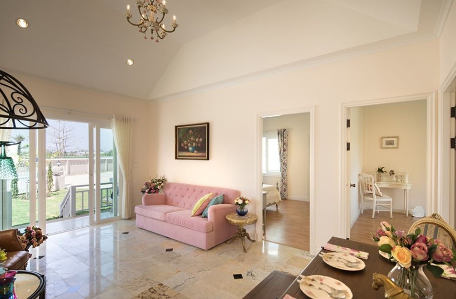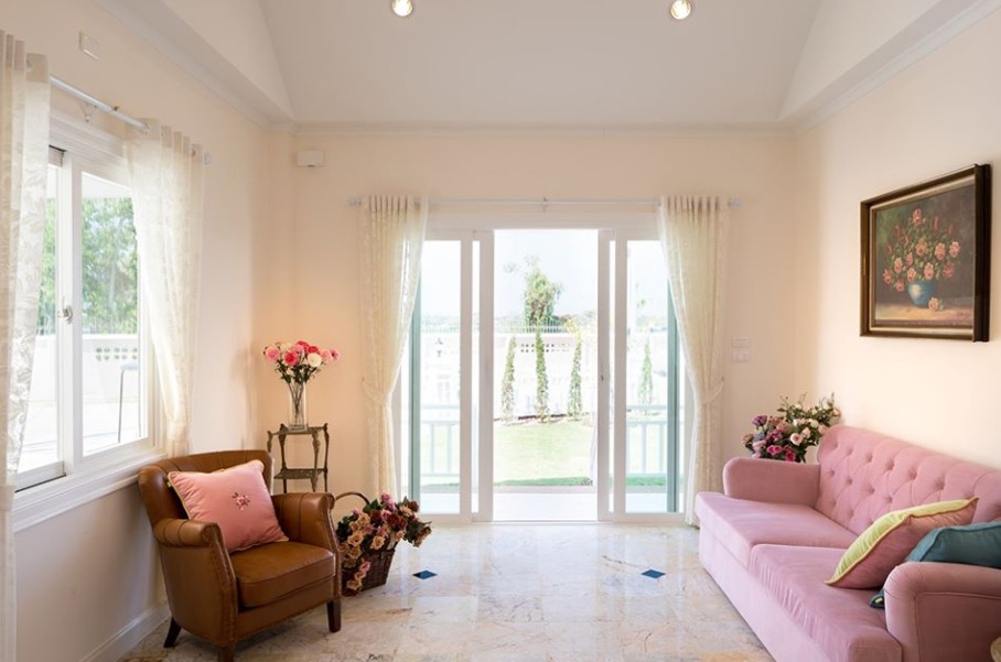 ภายในบ้านใช้โทนสีสบายตาอย่างสีครีมฝ้าเพดานยกสูง ติดโคมไฟแนววินเทจ เฟอร์นิเจอร์ต่างๆก็เป็นแนว วินเทจสวยงามเข้ากันทุกมุม