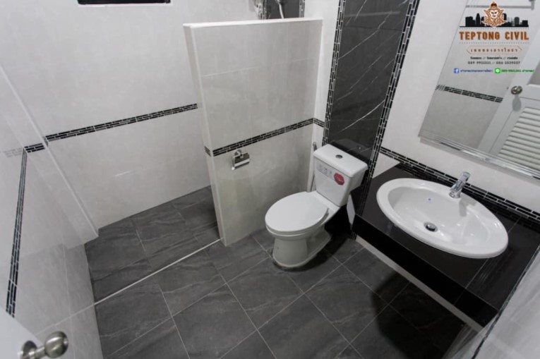 ห้องน้ำอีกห้องแยกส่วนเปียกแห้งเช่นเดียวกัน กระเบื้องโทนสีเทาขาวดูสวยงามแบบหรูหรา