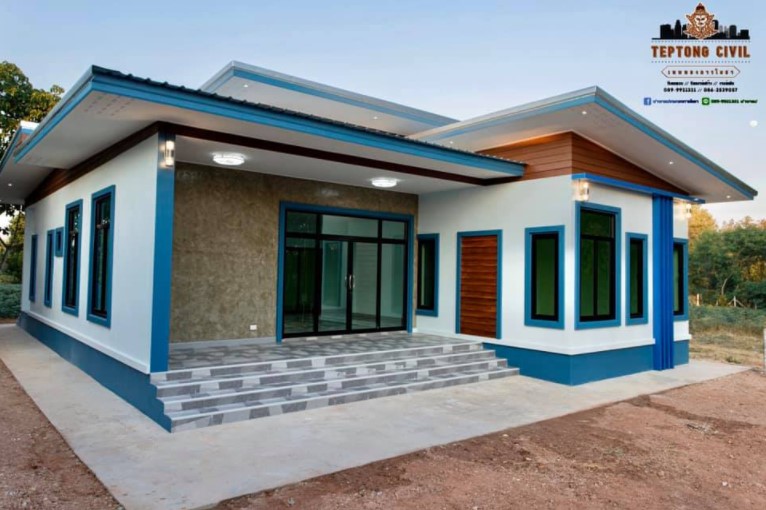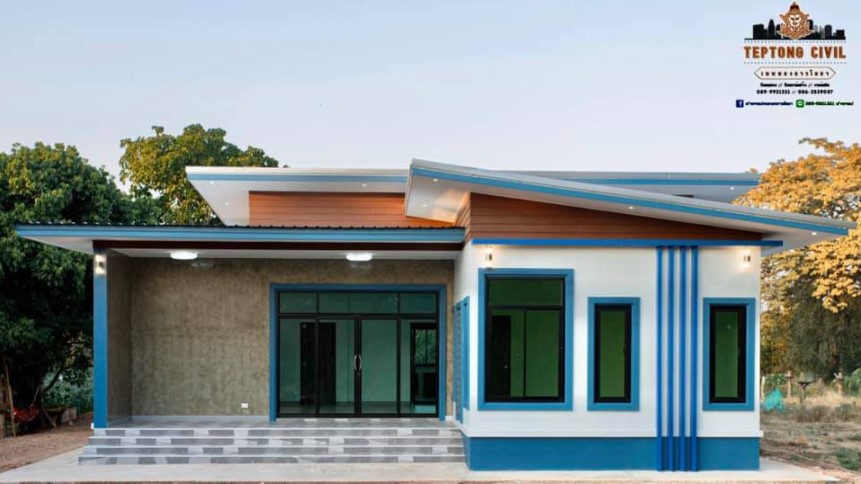 บ้านหลังนี้ออกแบบในสไตล์บ้านโมเดิร์น หลังคาเพิงแหงนซ้อนกันสามระดับดูทันสมัย ใต้หลังคาตกแต่งด้วยไม้ฝาทาสีน้ำตาลตัดขอบด้วยบัวปูนสีฟ้า ตัวบ้านยกพื้นสูงพอประมาณทาสีฟ้าเข้ม ผนังด้านนอกสีฟ้าโทนสีอ่อนและสีขาวส่วนด้านหน้าตกแต่งด้วยผนังปูนเปลือยสไตล์ลอฟท์ตัดด้วยบัวสีฟ้าเข้มช่วยให้บ้านดูสวยโดดเด่นมากยิ่งขึ้น ระแนงสีฟ้าบริเวณด้านหน้าบ้านดูสวยและทำให้บ้านดูโดดเด่นมากขึ้นเป็นองค์ประกอบที่ลงตัว
