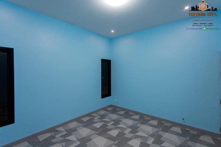ห้องนอนอีกห้องพื้นแบบเดียวกัน ผนังสีฟ้าสดใส