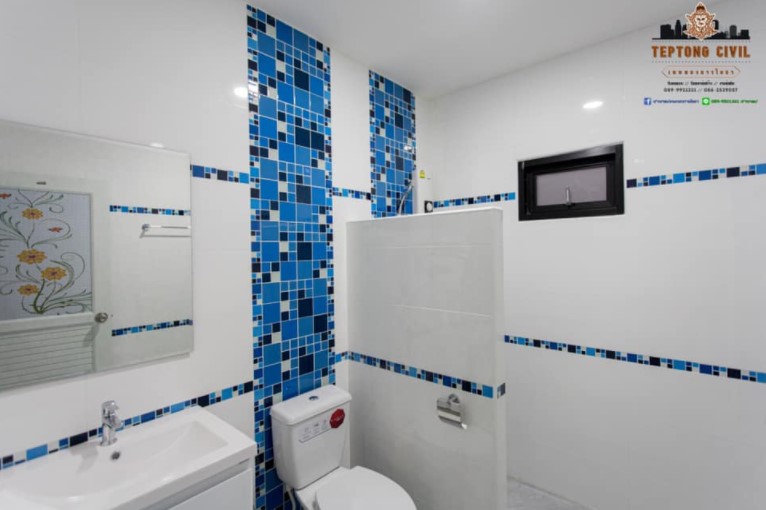 ห้องน้ำห้องแรกแยกส่วนเปียกแห้ง โทนสีขาวฟ้า