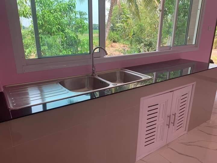 ห้องครัวขนาดกว้างขวาง เคาน์เตอร์ครัวปูกระเบื้องสีเทา ยาวตลอดแนว ห้องครัวโทนสีเดียวกับห้องอื่น มีหน้าต่างบนใหญ่ช่วยระบายความร้อน ระบายกลิ่นไม่พึงประสงค์