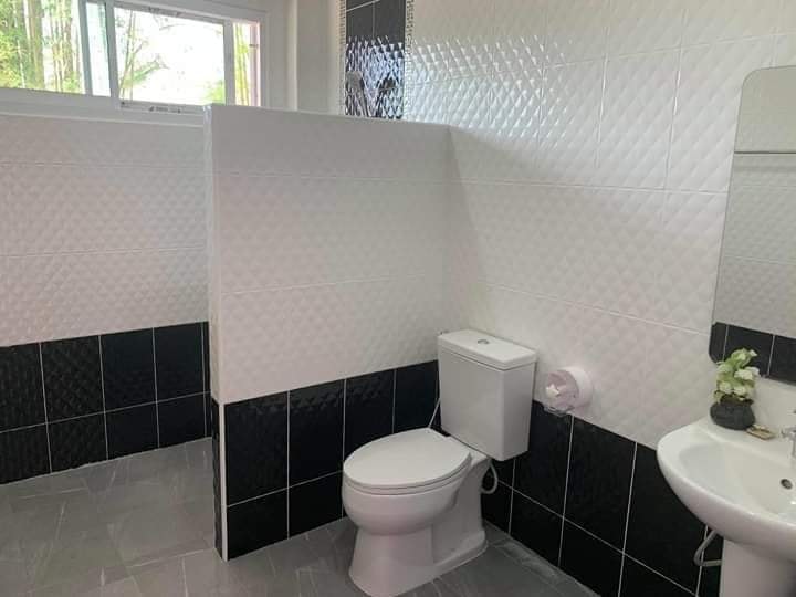 ห้องน้ำออกแบบเรียบง่าย ใช้โทนสีขาวดำดูทันสมัย แยกส่วนเปียกแห้ง มีหน้าต่างระบายอากาศ จัดวางสุขภัณฑ์ครบครันพร้อมใช้งาน