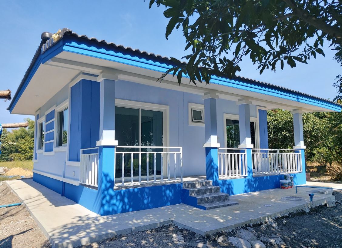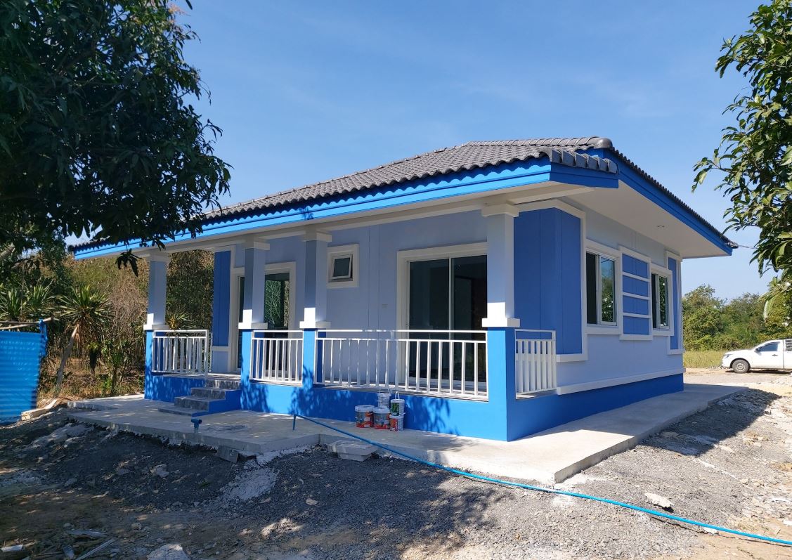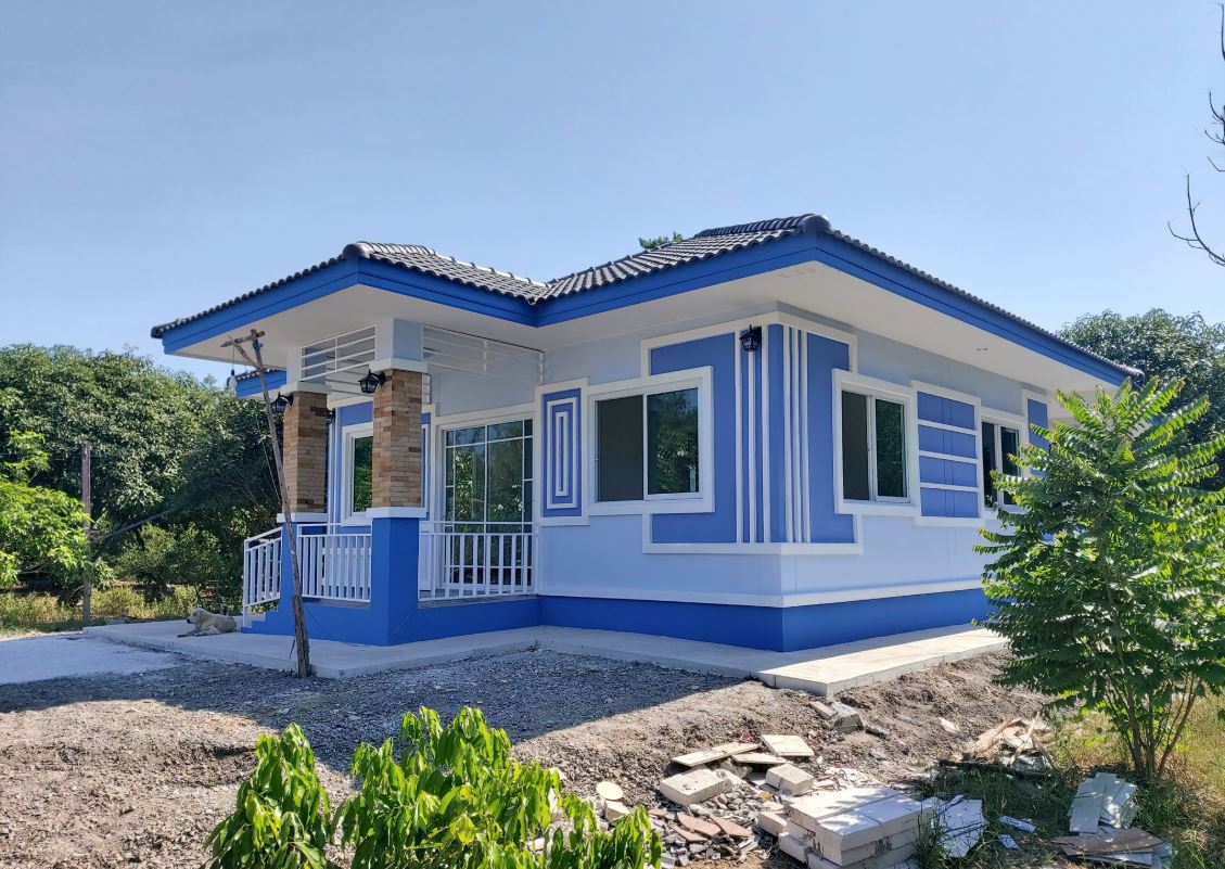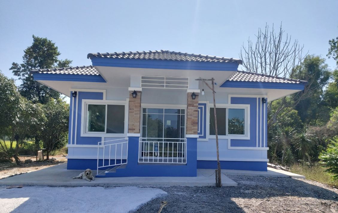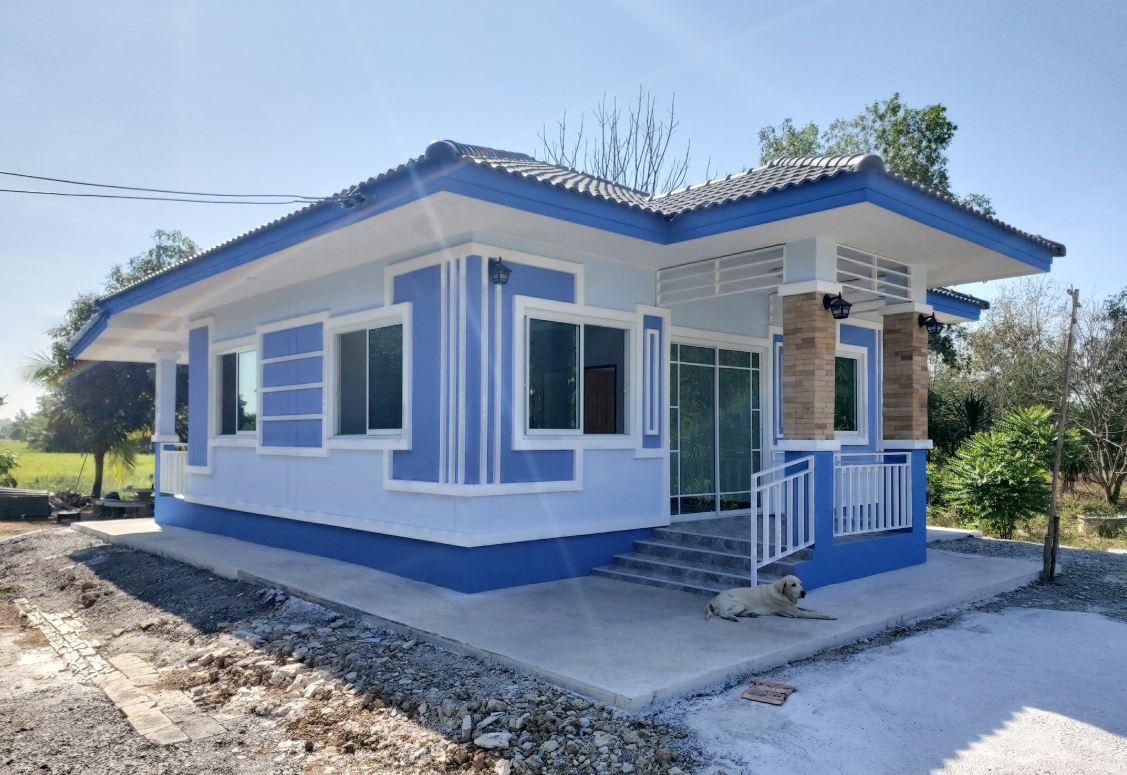 บ้านสวยหลังนี้เป็นบ้านเดี่ยวชั้นเดียว ก่อสร้างในสไตล์ร่วมสมัย คอนเทมโพรารี มุงหลังคาด้วยกระเบื้องลอนคู่ทรงปั้นหยาสีเทา มีหน้ามุกและระเบียงเล็กยื่นมาหน้าบ้าน เชิงชายของบ้านใช้ไม้สีฟ้า ฝ้าเพดานนอกบ้านให้แบบเรียบระบายอากาศ และตัวบ้านให้สีแบบทูโทนคือสีฟ้าอ่อนสลับกับใช้สีฟ้าเข้ม ตัวบ้านถูกยกสูงจากพื้นประมาณ 30 เซ็นติเมตร ใช้สีฟ้าน้ำทะเลสวยงามมาก