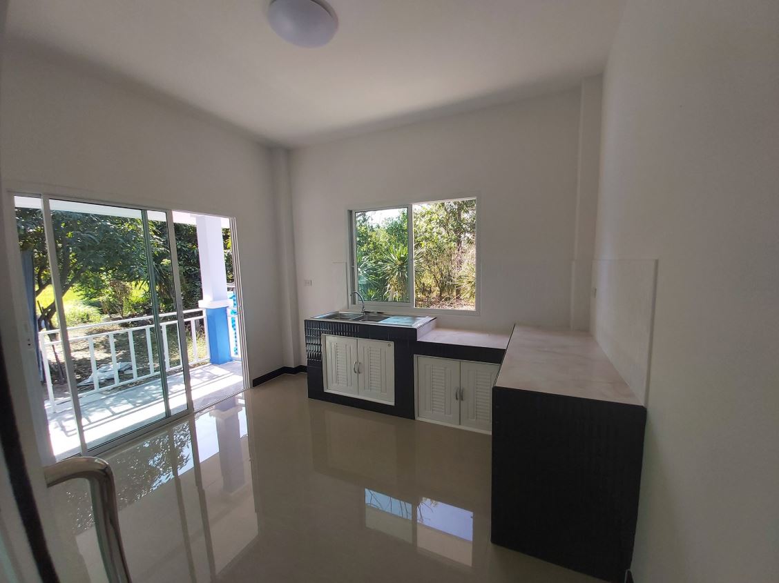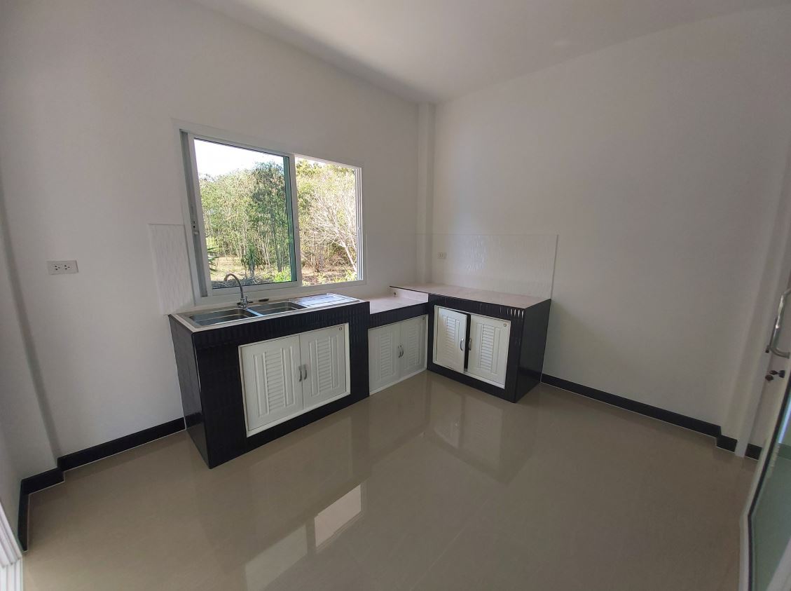 สำหรับห้องครัวได้มีการก่อเคาน์เตอร์แบบชิดผนังรูปตัวแอล ปูท็อปด้วยกระเบื้องหินอ่อนสีชมพู กรุด้วยกระเบื้องสีดำ มีตู้เก็บของด้านล้างพร้อมซิงค์ล้างจานแบบ 2 หลุม ห้องทั้งห้องใช้โทนสีขาวเช่นเดียวกับห้องอื่น ๆ ในส่วนของกระเบื้องปูพื้นใช้สีน้ำตาลอ่อน ห้องครัวมีประตูบานเลื่อนเช่นเดียวกับห้องนอนอีกห้องสามารถเดินออกไประเบียงหลังบ้านได้