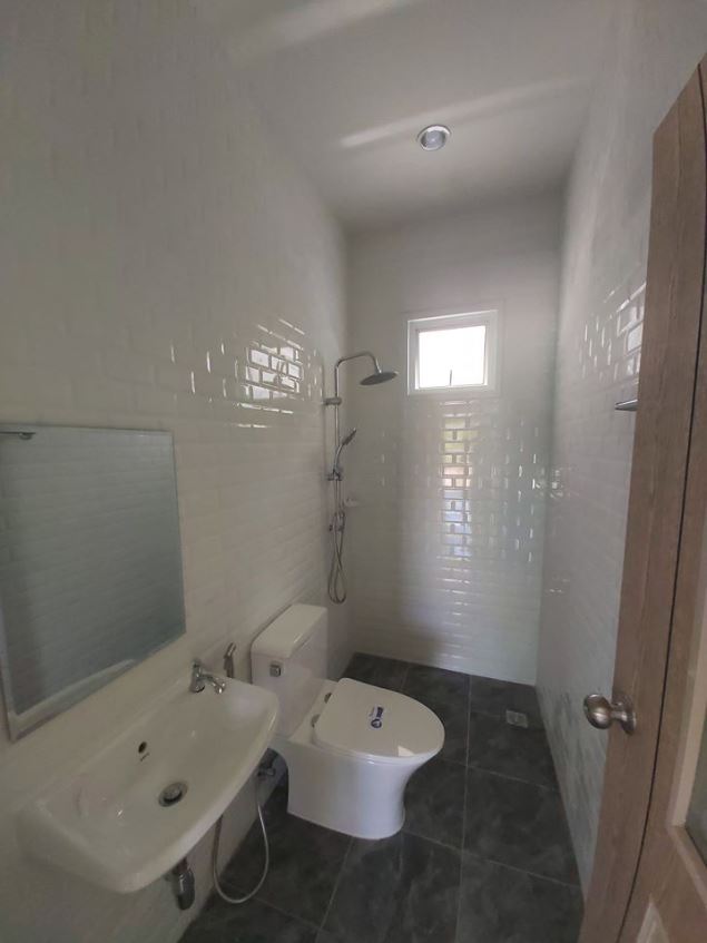 สำหรับห้องน้ำถูกแต่งเติมด้วยกระเบื้องปูพื้นลายหินกันลื่นโทนสีเทาเข้ม ด้านข้างกรุด้วยกระเบื้องลายอิฐสีขาว พร้อมกับเครื่องสุขภัณฑ์อย่างครบครัน