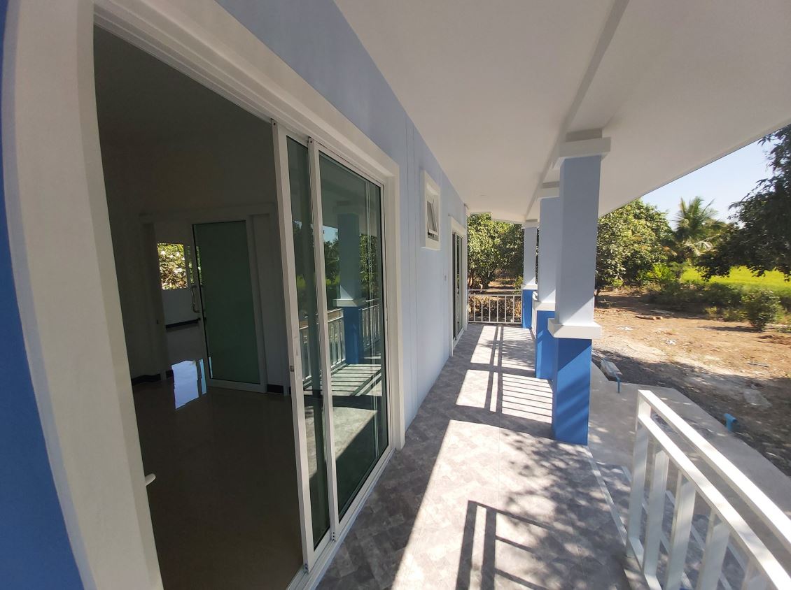 พื้นที่ด้านหลังของบ้านออกแบบใหมีระเบียงกว้าง พร้อมด้วยราวระเบียงเหล็กสีขาวสวยงาม ตกแต่งเสาบ้านด้วยสีฟ้าอ่อนแล้วล้องกรอบบนและล่างของเสาด้วยบัวปูนสีขาว พื้นที่ระเบียงสามารถใช้เป็นพื้นที่ประกอบอาหารหรือใช้ทำกิจกรรมอื่น ๆ ของคนในครบครัว นอกจากพื้นที่ระเบียงที่กว้างขวางแล้วยังสามารถลงมาใช้ลานซักล้างที่หลังบ้านได้อีกด้วย