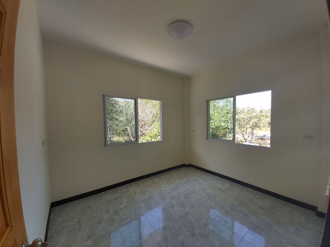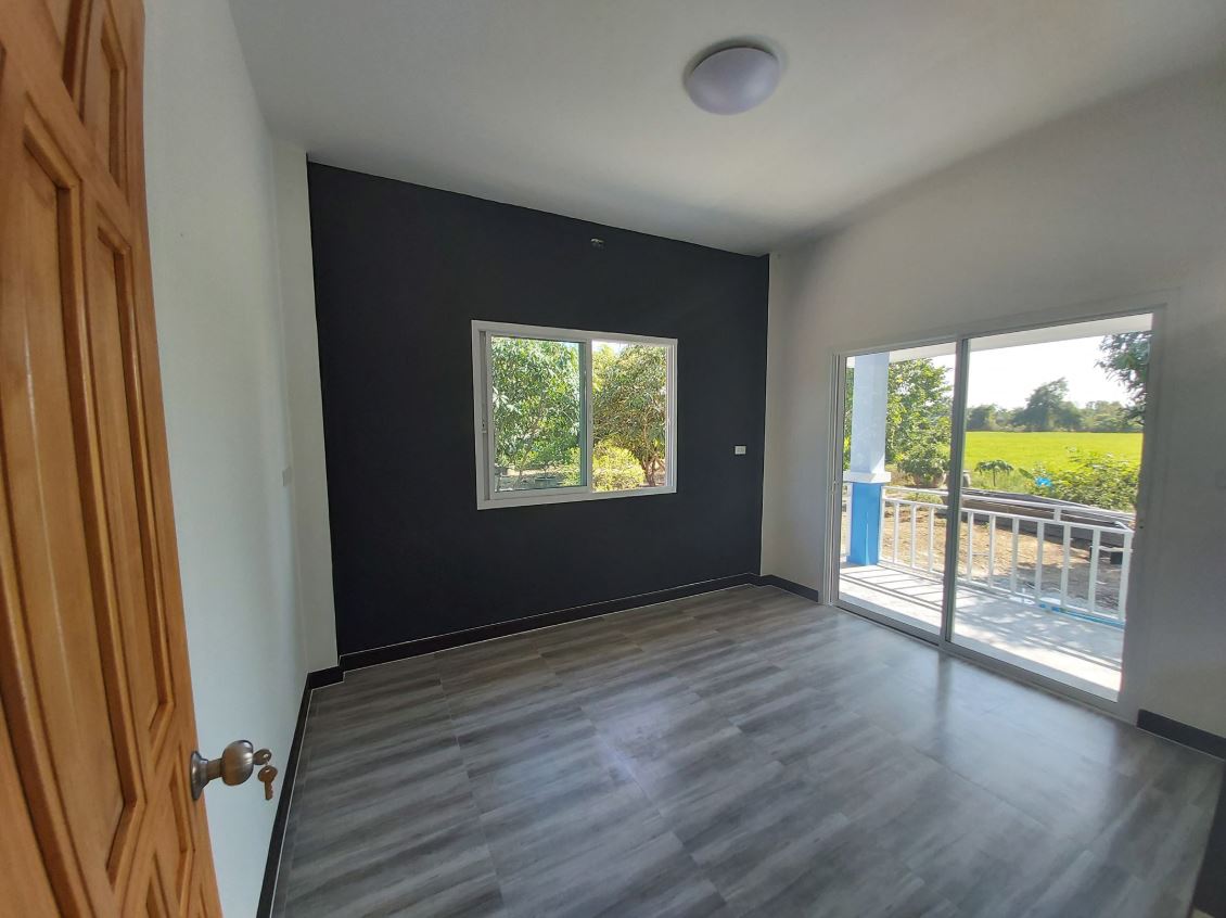 ห้องนอนอีกห้อง ถูกตกแต่งให้โดดเด่นที่ผนังห้องด้านหนึ่งทาด้วยสีเทาเข้ม พร้อมกับติดตั้งประตูบานเลื่อนเพื่อให้สามารถออกไปยังเป็นระเบียงหลังบ้านผนังส่วนอื่นๆ ใช้เป็นโทนสีขาวแต่งเติมพื้นกระเบื้องโทนสีเทาลายไม้
