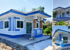 บ้านสวยหลังนี้เป็นบ้านเดี่ยวชั้นเดียว ก่อสร้างในสไตล์ร่วมสมัย คอนเทมโพรารี มุงหลังคาด้วยกระเบื้องลอนคู่ทรงปั้นหยาสีเทา มีหน้ามุกและระเบียงเล็กยื่นมาหน้าบ้าน เชิงชายของบ้านใช้ไม้สีฟ้า ฝ้าเพดานนอกบ้านให้แบบเรียบระบายอากาศ และตัวบ้านให้สีแบบทูโทนคือสีฟ้าอ่อนสลับกับใช้สีฟ้าเข้ม ตัวบ้านถูกยกสูงจากพื้นประมาณ 30 เซ็นติเมตร ใช้สีฟ้าน้ำทะเลสวยงามมาก
