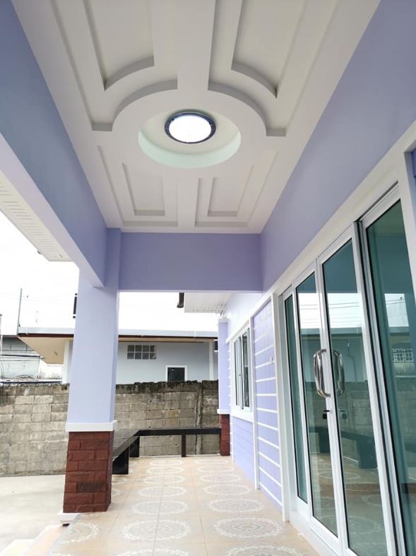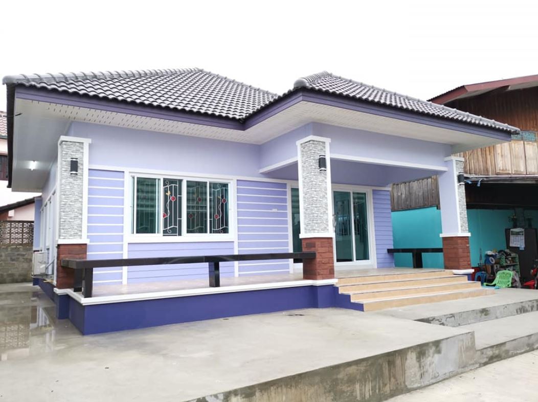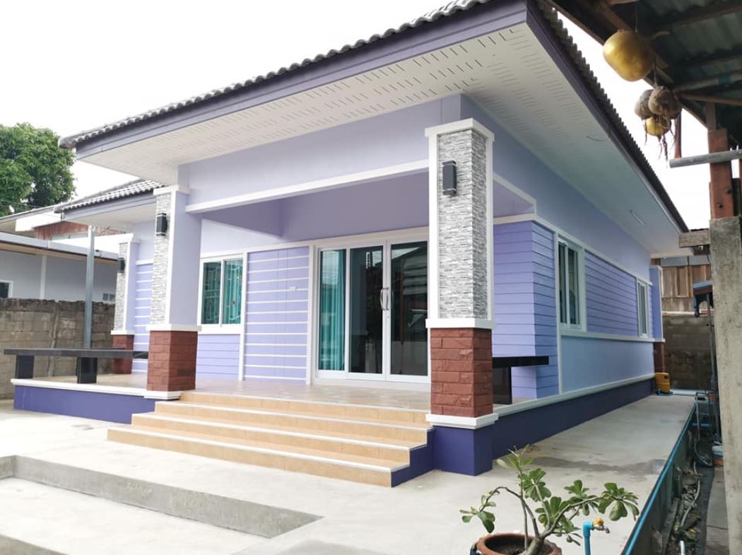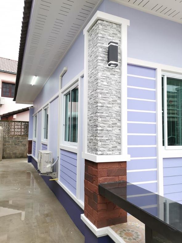 ตัวบ้านสีม่วงสวยงาม มีการเลือกใช้ใช้ได้อย่างลงตัว ทั้งผนังบ้านและฐานของบ้าน ที่ผนังของบ้านมีการตกแต่งด้วยไม้ฝาเทียมกรุตกแต่งผนังบางส่วนให้บ้านดูเด่นยิ่งขึ้น เสาหน้าบ้านกรุด้วยกระเบื้องหินทรายสีเทาล้อมกรอบด้วยบัวปูนสีขาว เสาด้านล่างกรุด้วยกระเบื้องลายอิฐสีแดงเข้ม บ้านไดหน้าบ้านปูด้วยกระเบื้องลายสวย พร้อมด้วยการเทปูนที่ฐานบ้านโดยรอบเพื่อเสริมความมั่นคงแข็งแรงให้กับบ้านด้วย