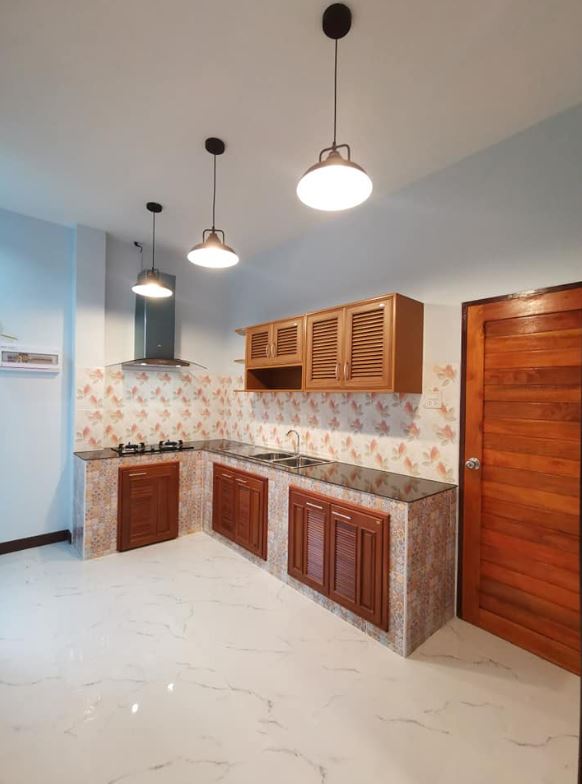 ห้องครัวขนาดใหญ่ ที่มีอุปกรณ์ครบครัน ทั้งเคาน์เตอร์ทำอาหาร อ่างล้างจาย เตาแก๊ส ที่ดูดควัน พร้อมโคมไฟวินเทจดวงสวย 3 ดวง และพื้นกระเบื้องลายหินอ่อนสีขาวสะอาดตา