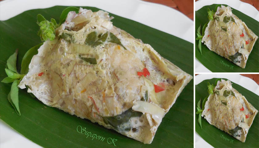 – นำส่วนผสมห่อใส่ใบตอง แล้วนำไปนึ่งบนน้ำเดือด 20-25 นาที