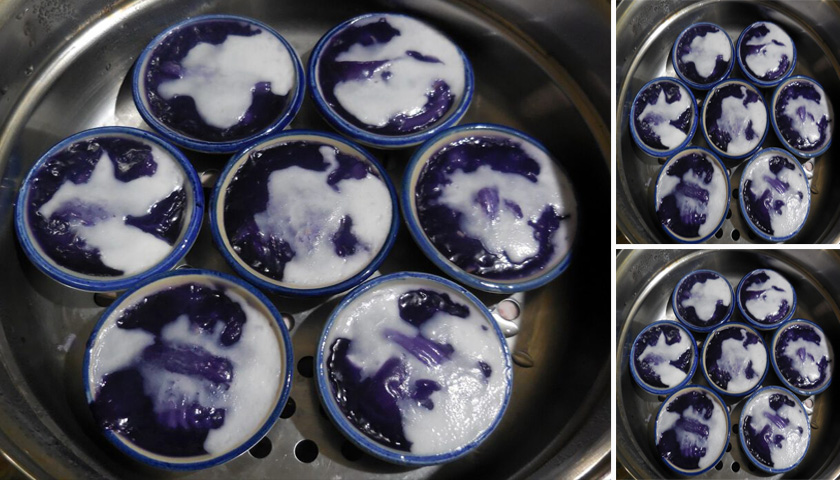 – ใส่เนื้อมะพร้าวอ่อนลงไป คนให้เข้ากัน ตักใส่กระทงใบตอง นึ่งบนน้ำเดือด 15 นาที แล้วใส่มะพร้าวอ่อนแต่งหน้าด้านบน นึ่งต่ออีก 5 นาที