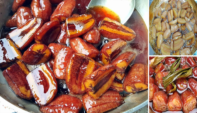 6. หมั่นช้อนฟองดำ ๆ บนผิวกล้วยออกทิ้ง แล้วใช้ไม่ไผ่ปลายแหลม ๆ ค่อยๆ เขี่ยชิ้นกล้วยพลิกกลับไปมา แต่ห้ามคนๆๆ โดยเด็ดขาด ถ้าจะคนกล้วยจากด้านล่างขึ้นมาด้านบนให้สุกโดยทั่วทุกชิ้น ต้องใช้ไม้พายค่อย ๆ ช้อนเบา ๆ จากด้างล่างขึ้นบน ใช้วิธีช้อนขึ้น